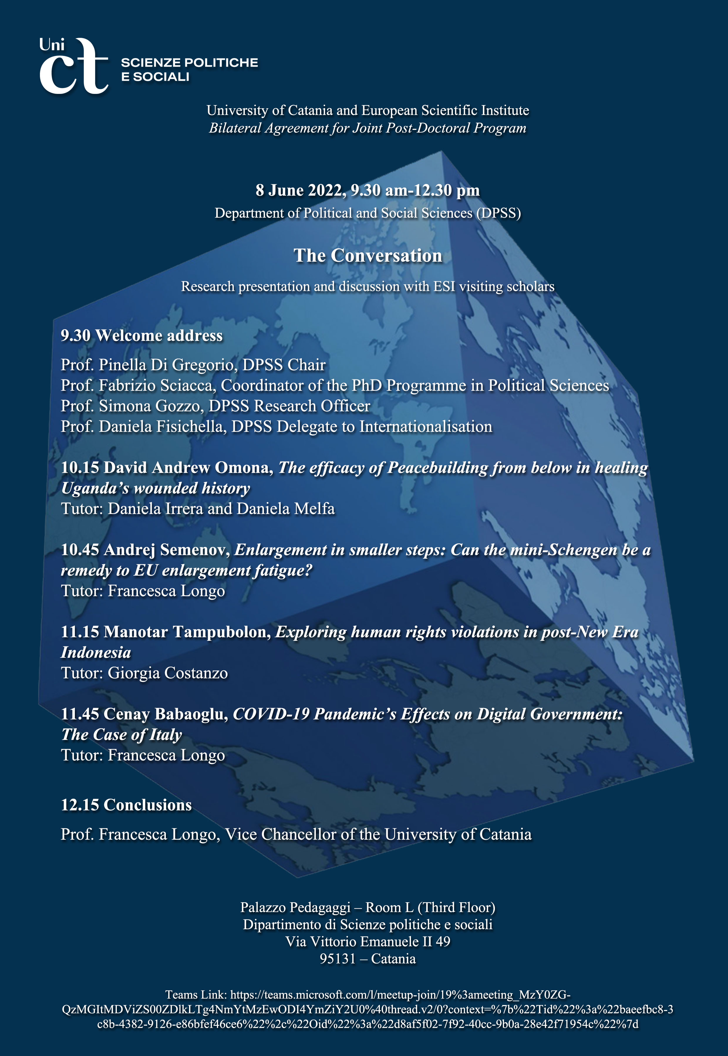 L'incontro, aperto a tutti gli interessati, si terrà in aula L, al terzo piano di palazzo Pedagaggi, dalle 9:30 alle 12:30.