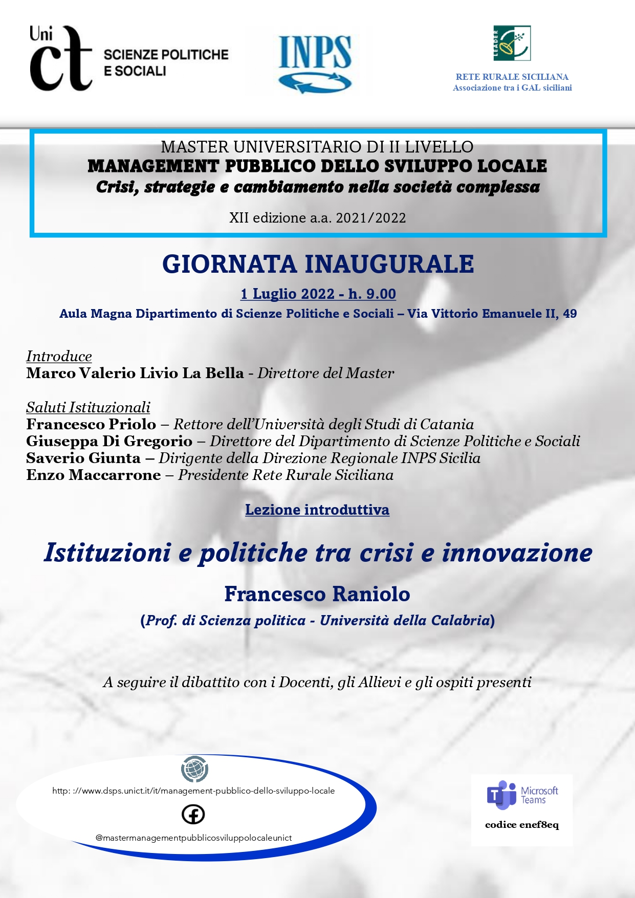 Giornata inaugurale della XII edizione del Master di II livello in Management pubblico dello sviluppo locale, a.a. 2021-2022, che si svolgerà presso l'aula magna del DSPS il prossimo 1 luglio 2022.