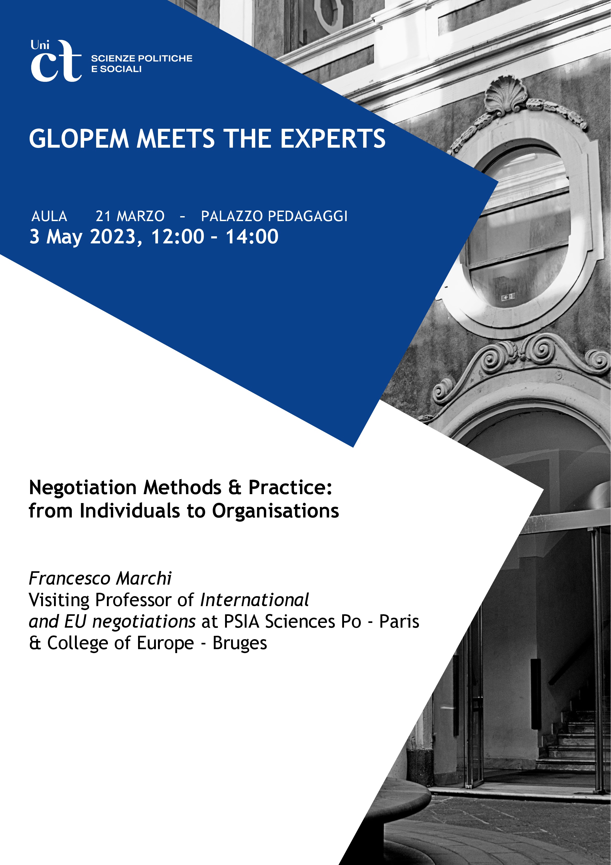 Visiting Professor of International and EU negotiations at PSIA Sciences Po - Paris & College of Europe - Bruges con una relazione dal titolo: "Negotiation Methods & Practice: from Individuals to Organisations"