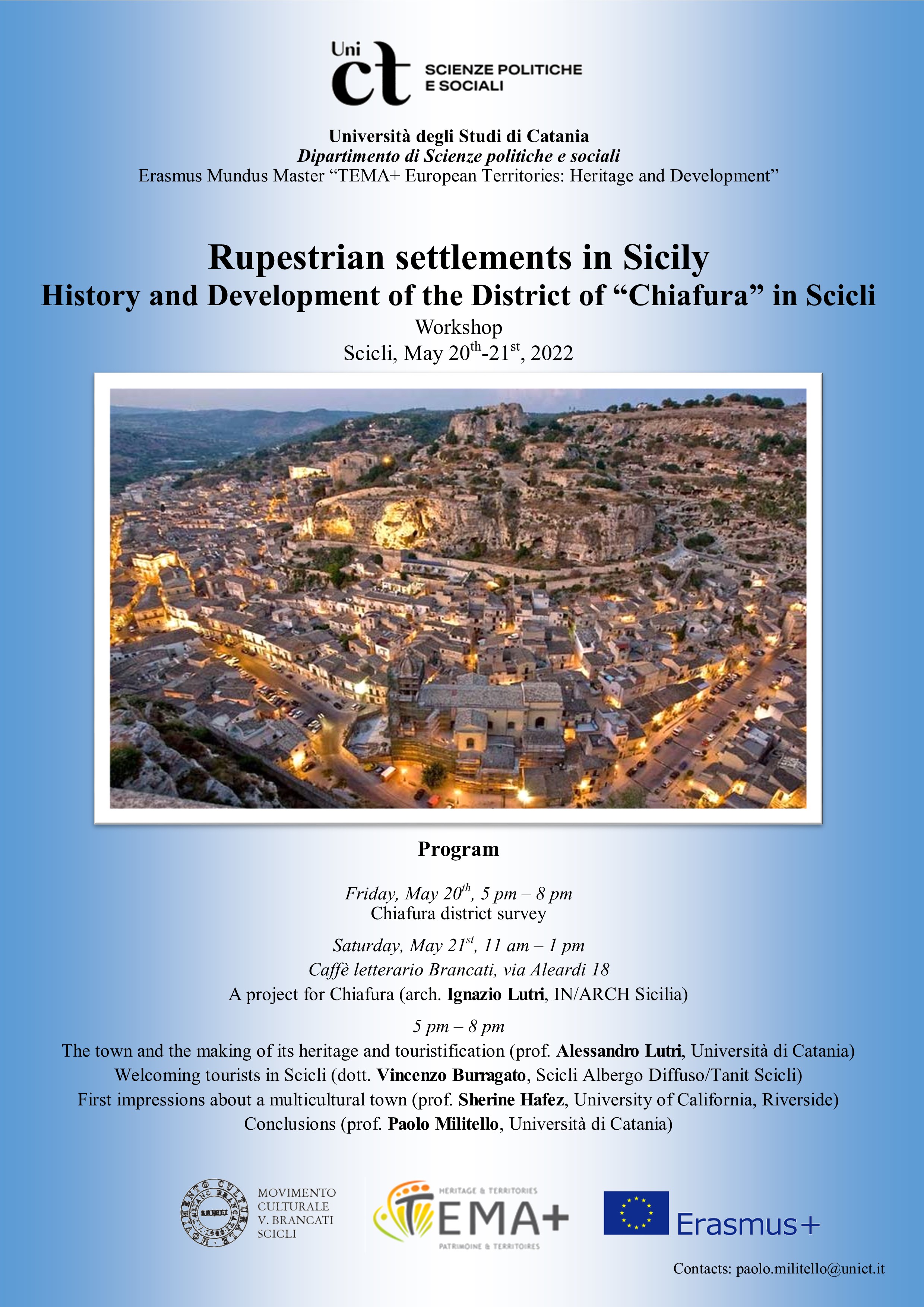Il workshop è destinato principalmente agli studenti stranieri del Master Erasmus Mundus “TEMA+ European Territories: Heritage and Development”, percorso internazionalizzato del Corso di Laurea Magistrale in “Storia e cultura dei Paesi mediterranei”. Chi fosse interessato a partecipare, può comunque fare richiesta all’indirizzo email paolo.militello@unict.it