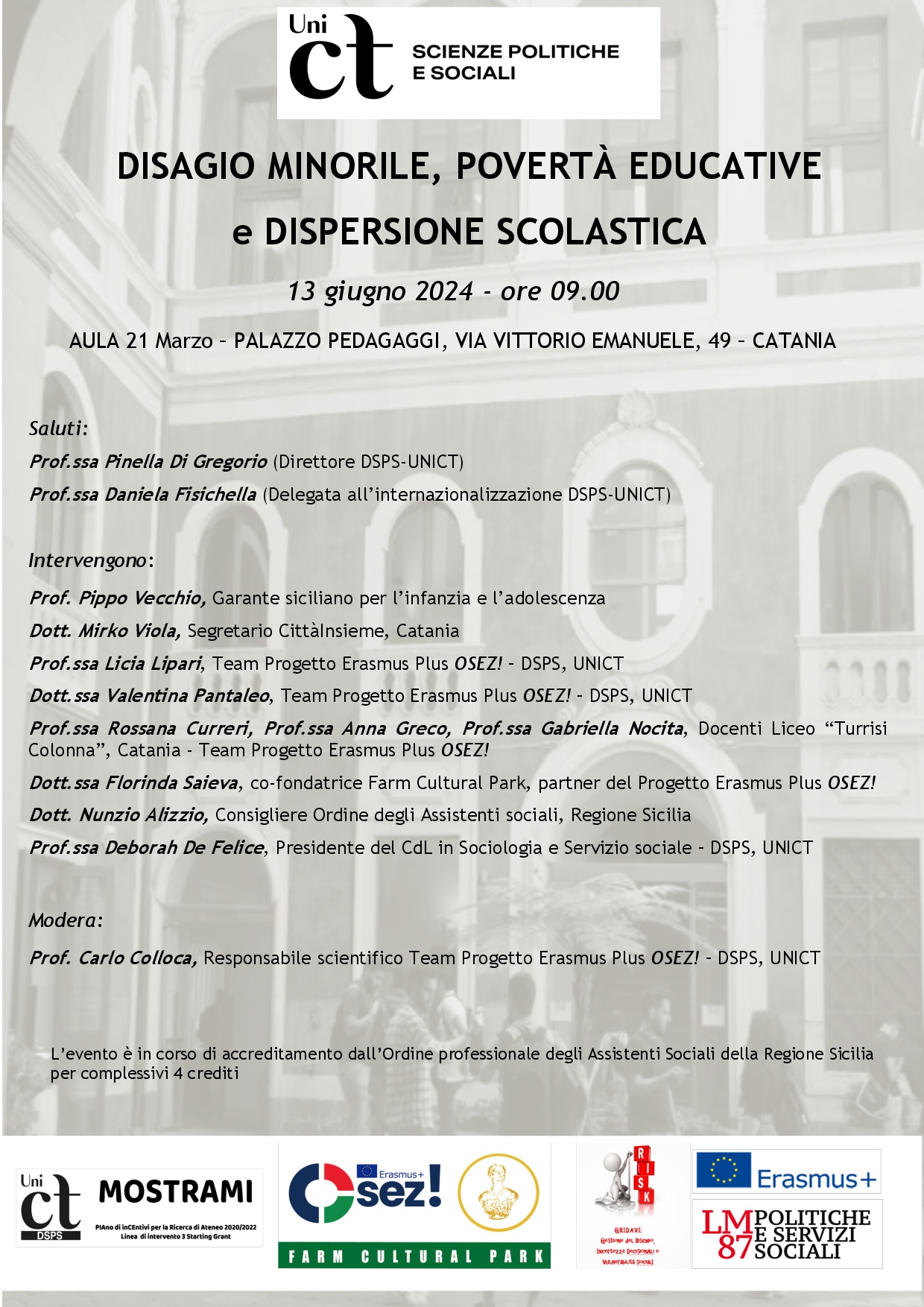 Giovedì 13 giugno 2024, alle ore 9.00 presso l’aula 21 Marzo di palazzo Pedagaggi (via Vittorio Emanuele, 49, CT) del Dipartimento di Scienze Politiche e Sociali si terrà il convegno “Disagio minorile, povertà educative e dispersione scolastica” nell’ambito delle attività del progetto Erasmus plus dal titolo “Osez! Des Collectifs de travail apprenants pour mieux accompagner le changement” che coinvolge la Francia, la Bulgaria, la Guyana Francese e Saint-Pierre e Miquelon.