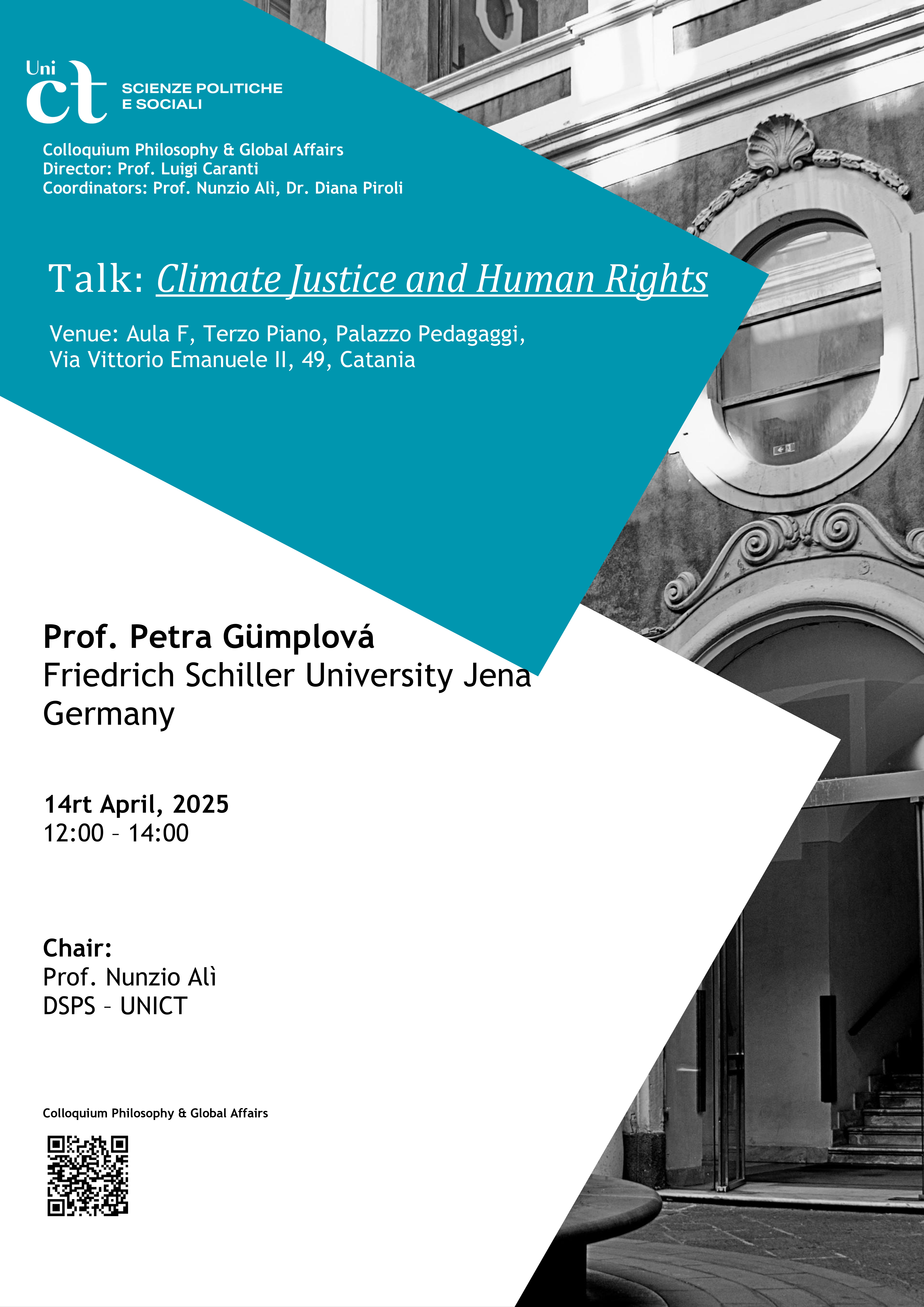 Il Colloquium Philosophy & Global Affairs vi invita a partecipare alla lezione che la Prof.ssa Petra Gümplová (Friedrich Schiller University Jena, Germania) terrà giorno 14 aprile 2025, dalle ore 12:00 alle 14:00, dal titolo rispettivamente “Climate Justice and Human Rights” presso il Dipartimento di Scienze Politiche e Sociali (Università di Catania), Aula F, Terzo Piano, Palazzo Pedagaggi, Via Vittorio Emanuele II, 49, Catania.