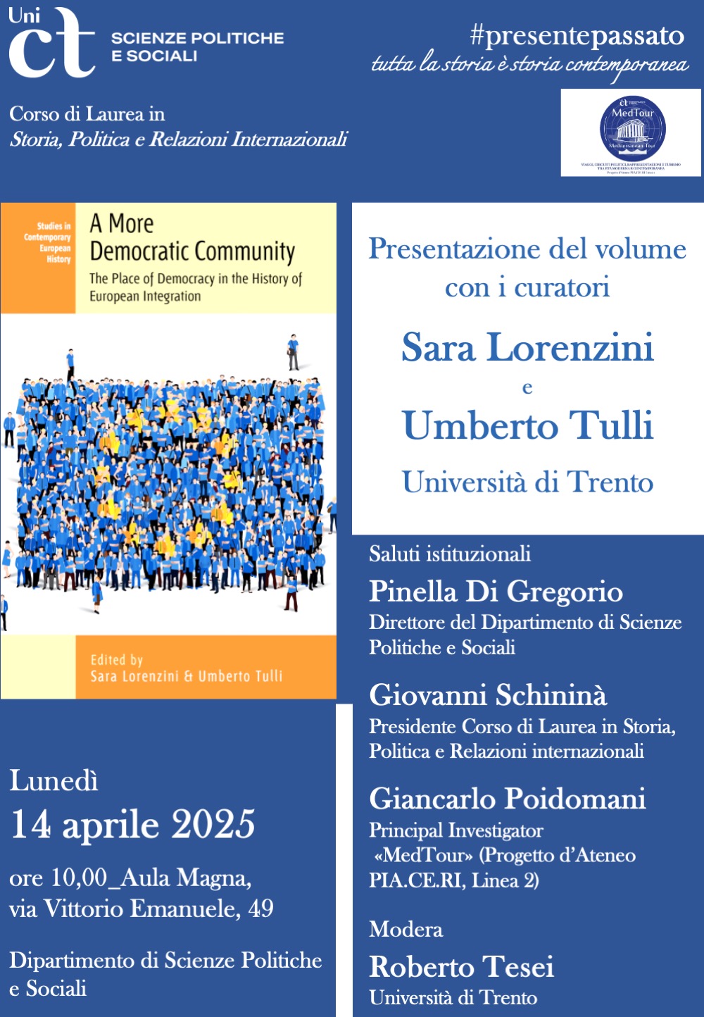 Lunedì 14 aprile, alle ore 10.00, presso il Dipartimento di Scienze Politiche e Sociali (Aula Magna di Palazzo Pedagaggi, via Vittorio Emanuele, 49), un nuovo appuntamento del ciclo di incontri #presentepassato, con la presentazione del volume a cura di Sara Lorenzini e Umberto Tulli (Università di Trento) dal titolo A More Democratic Community: The Place of Democracy in the History of European Integration, con la partecipazione di Pinella Di Gregorio, direttore del DSPS. L’incontro sarà moderato da Roberto Tesei.