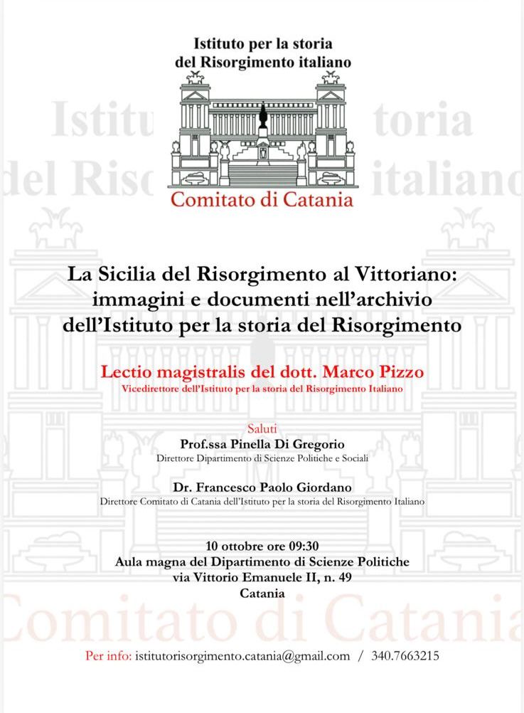 Venerdì 10 ottobre 2025 alle ore 9:30 presso l’ Aula Magna di Palazzo Pedagaggi, Via Vittorio Emanuele II, 49 – Catania, il Comitato di Catania dell’Istituto per la storia del Risorgimento italiano, ospiterà il vicedirettore nazionale dott. Marco Pizzo, che terrà una Lectio Magistralis, dal titolo La Sicilia del Risorgimento al Vittoriano: immagini e documenti nell’archivio dell’Istituto per la storia del Risorgimento.