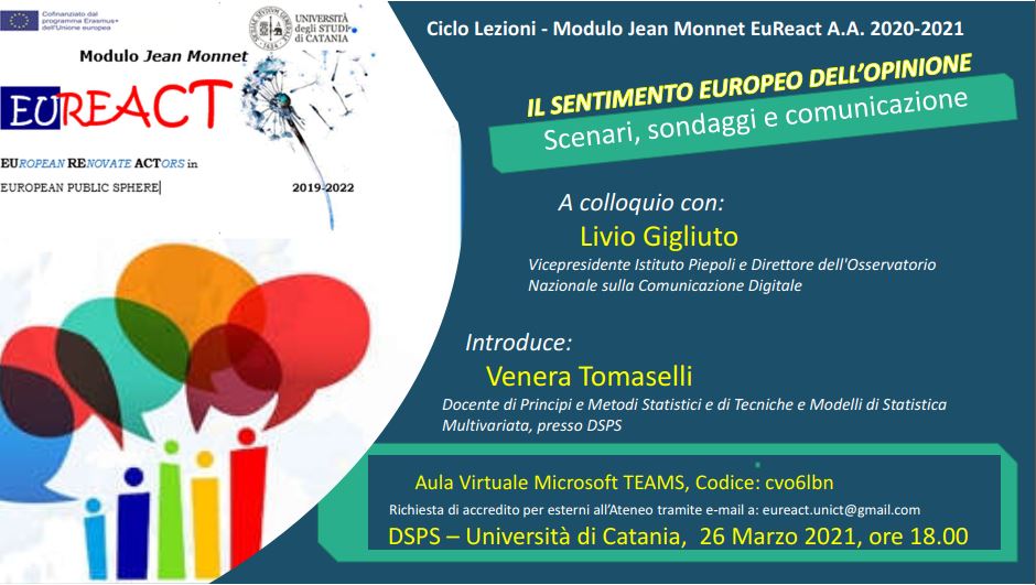 Nell’ambito delle attività del Modulo Jean Monnet Eureact, avrà luogo una lezione del Dott. LIVIO GIGLIUTO, Vicepresidente Istituto Piepoli e Direttore dell'Osservatorio Nazionale sulla Comunicazione Digitale L’incontro dal titolo IL SENTIMENTO EUROPEO DELL’OPINIONE: scenari, sondaggi e comunicazione affronterà le problematiche connesse allo studio dei movimenti di opinione all’interno dell’Unione Europea, soffermandosi sulle strategie di indagine. L’incontro sarà introdotto dalla Prof. Venera Tomaselli, Docente di Principi e Metodi Statistici e di Tecniche e Modelli di Statistica Multivariata, presso il DSPS