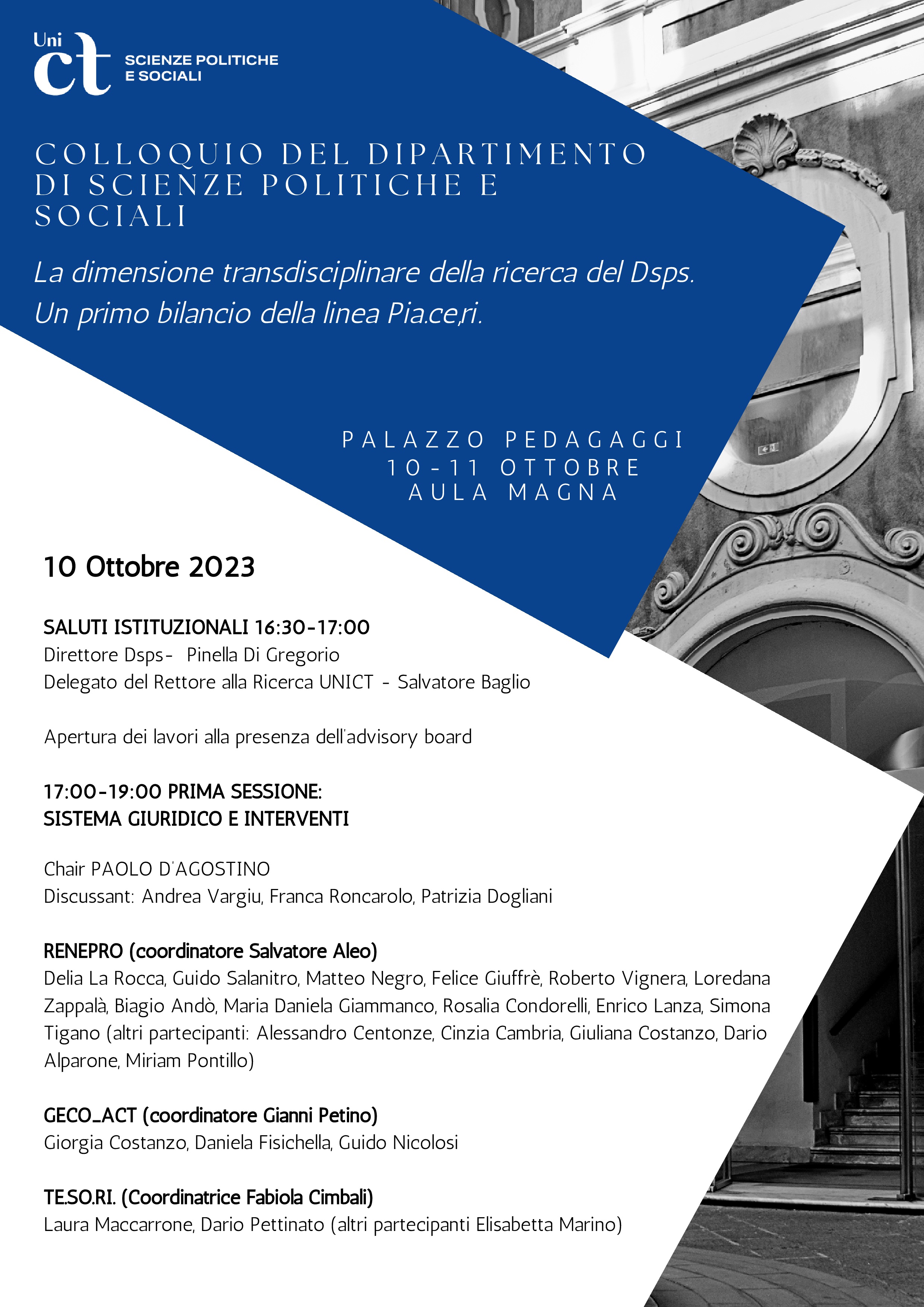 I diversi gruppi di ricerca si succederanno nelle giornate del 10-11 ottobre 2023 nell'Aula Magna di Palazzo Pedagaggi per presentare le conclusioni preliminari del loro lavoro di riflessione e ricerca sul campo.