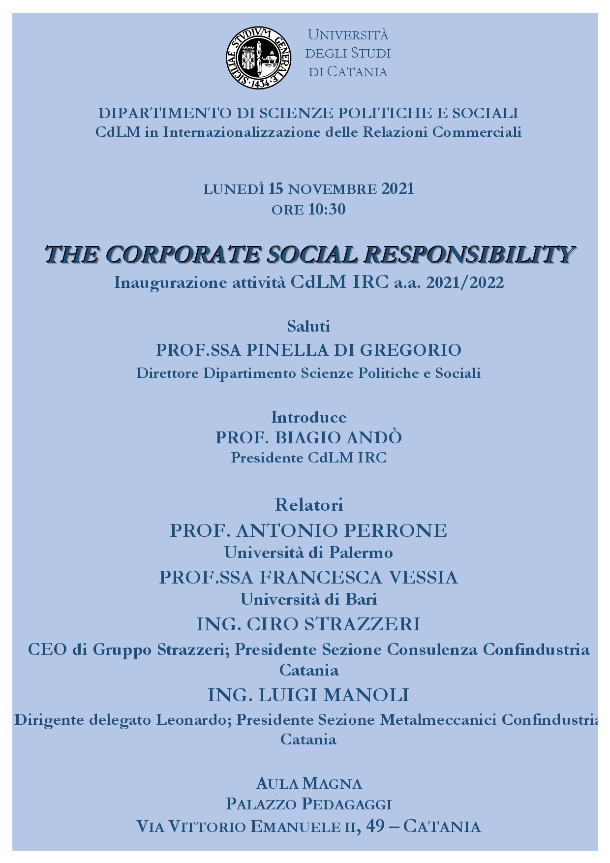 Giorno 15 novembre 2021 presso l’Aula magna del Dipartimento si terrà la presentazione del Corso di Laurea Magistrale in Internazionalizzazione delle relazioni commerciali. In questa occasione, verrà proposta una riflessione sul tema della responsabilità sociale d’impresa (corporate social responsibility). La discussione intreccerà analisi teorica e problemi della pratica ponendo a confronto esponenti dei mondi dell’Università (Antonio Perrone, Università di Palermo; Francesca Vessia, Università di Bari) e dell’impresa (Luigi Manoli, Dirigente delegato Leonardo; Ciro Strazzeri, CEO Gruppo Strazzeri).