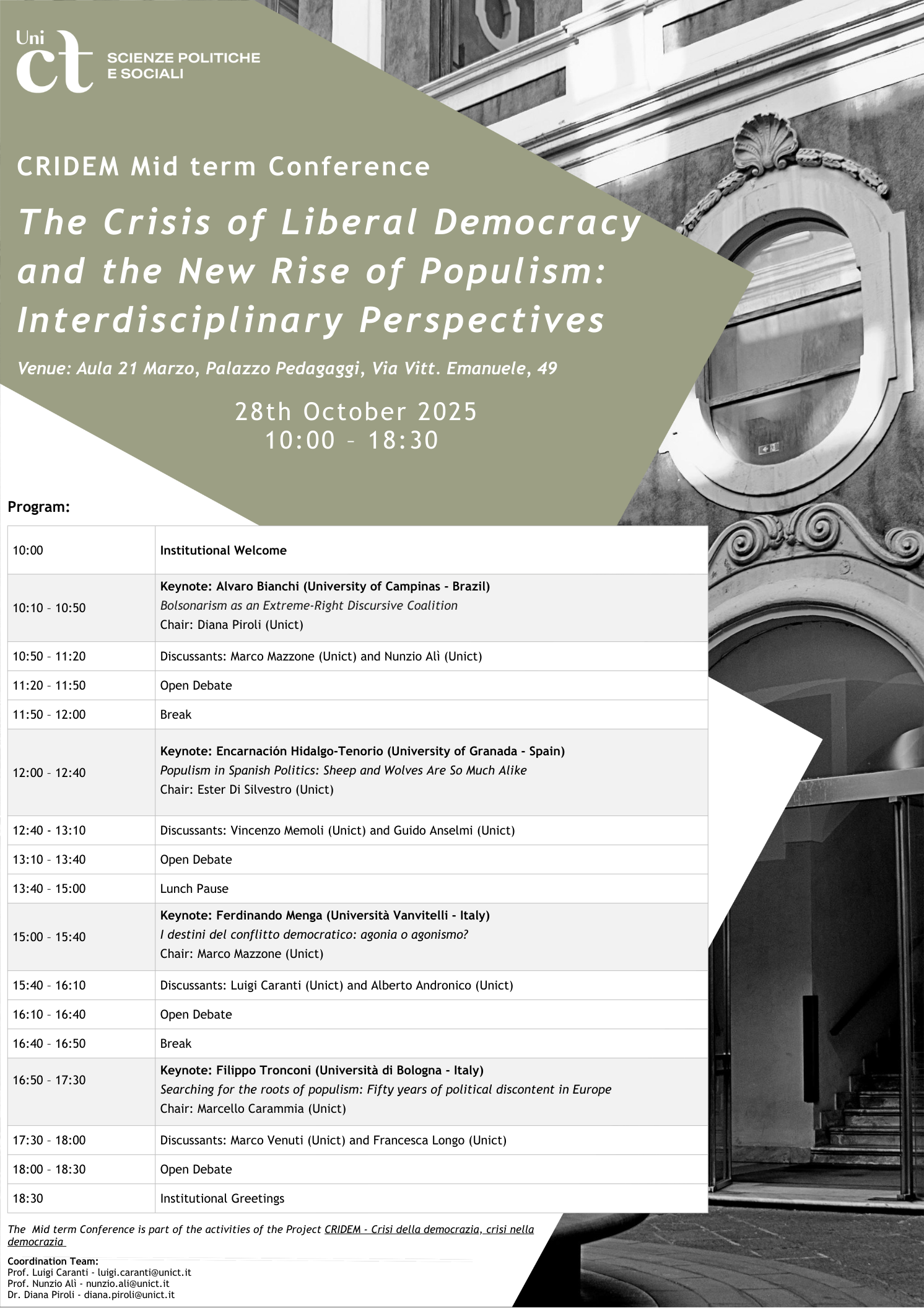 I Dipartimenti di Scienze Politiche e Sociali (DSPS), di Scienze Umanistiche (DISUM) e di Giurisprudenza (LEX) dell’Università di Catania invitano a partecipare, martedì 28 ottobre 2025 dalle ore 10:00 alle 18:30, presso il Dipartimento di Scienze Politiche e Sociali, Aula 21 Marzo del Palazzo Pedagaggi (Via Vittorio Emanuele 49), alla Mid-term Conference “The Crisis of Liberal Democracy and the New Rise of Populism: Interdisciplinary Perspectives”, organizzata nell’ambito del progetto CRIDEM – Pia.ce.ri. La giornata vedrà la partecipazione di keynote speaker internazionali – Alvaro Bianchi (University of Campinas, Brasile), Encarnación Hidalgo-Tenorio (University of Granada, Spagna), Ferdinando Menga (Università Vanvitelli, Italia) e Filippo Tronconi (Università di Bologna, Italia) – e di numerosi discussant dei tre Dipartimenti, in un confronto interdisciplinare sui temi della crisi delle democrazie liberali e della nuova ascesa del populismo.