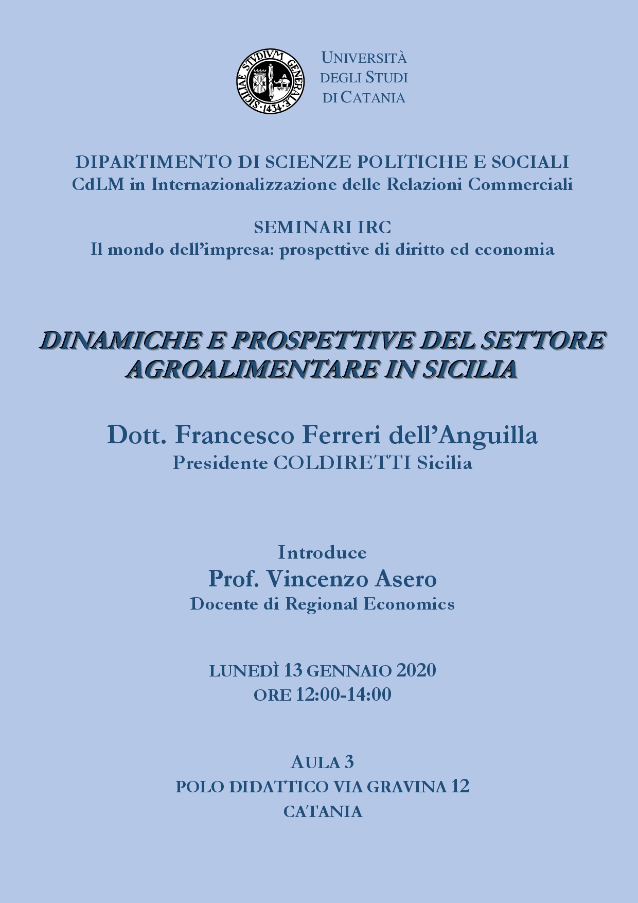 Su questo tema sarà incentrato l’incontro con il Dott. Francesco Ferreri dell’Anguilla, Presidente COLDIRETTI Sicilia, che si svolgerà il 13 gennaio nell’ambito delle attività didattiche di Regional Economics.