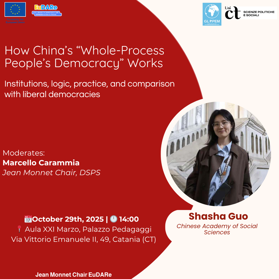 Shasha Guo, dottoranda dell’Accademia Cinese delle Scienze Sociali in visita al Dipartimento di Scienze Politiche e Sociali, discuterà di un concetto centrale nel discorso politico contemporaneo cinese: il modello della “democrazia popolare come processo integrale” (Whole-Process People’s Democracy). Saranno analizzate le basi istituzionali, i meccanismi operativi e la logica di fondo. Verrà inoltre proposta un’analisi comparata delle somiglianze e delle differenze tra il modello di democrazia cinese e la democrazia liberale occidentale.