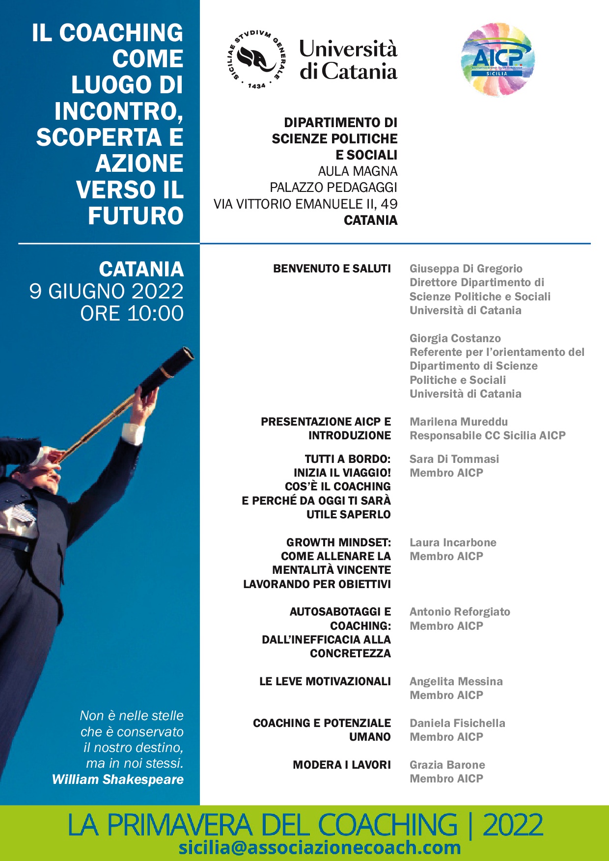 “Il Coaching come luogo di incontro, scoperta e azione verso il futuro” - Evento organizzato dal C.O.F.&P. dell'Università di Catania in collaborazione con l’Associazione Italiana Coach Professionisti (AICP), per far conoscere la metodologia del coaching come strumento per allenare le proprie potenzialità ed esprimere al meglio i propri talenti.