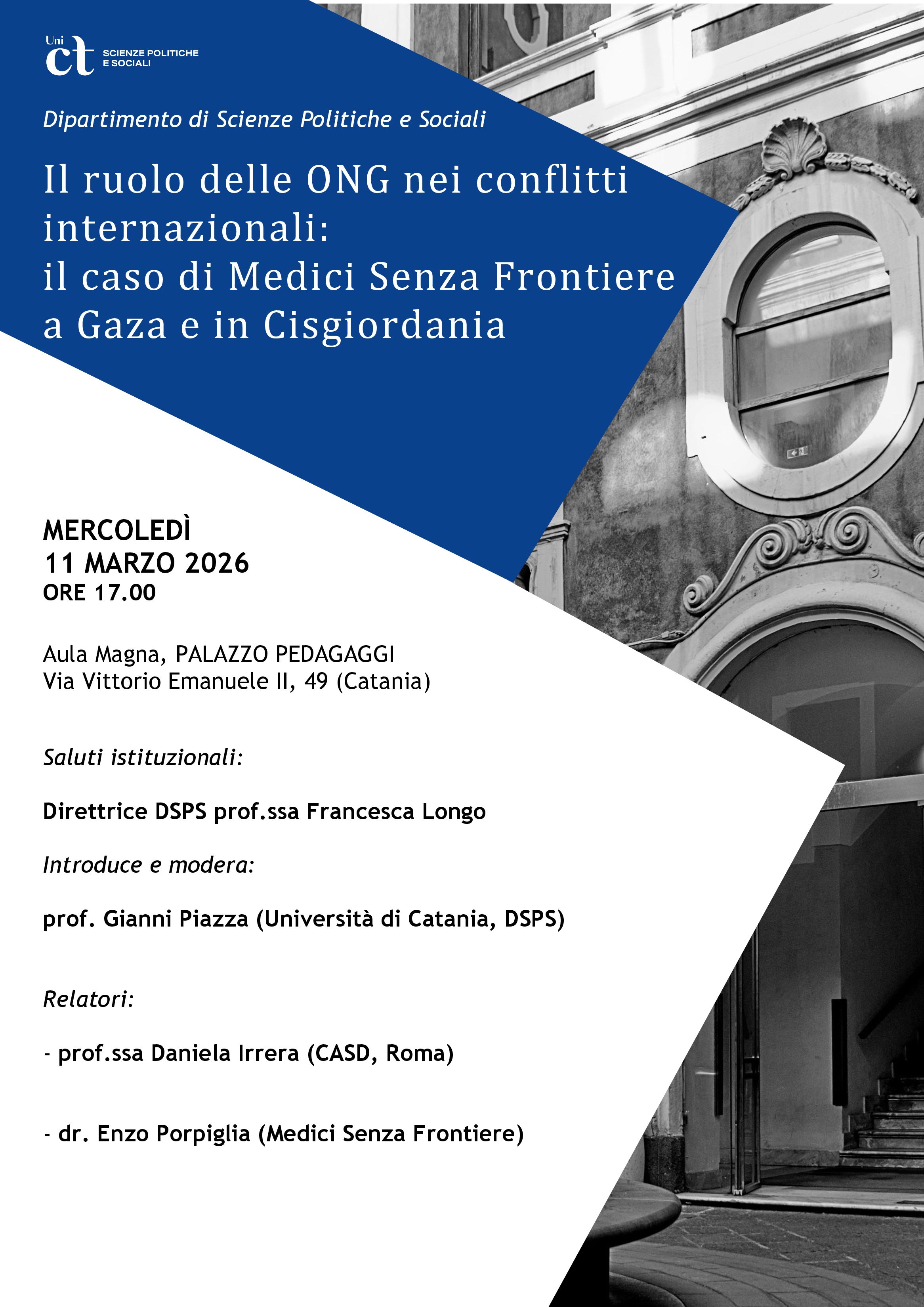 Quale ruolo svolgono le ONG nei conflitti internazionali? Dopo un inquadramento generale della prof.ssa Daniela Irrera (CASD, Roma), la conferenza si focalizzerà sul caso di Medici senza Frontiere a Gaza e in Cisgiordania. Attraverso la testimonianza diretta del Coordinatore per le emergenze, il dr. Enzo Porpiglia, verranno raccontate la realtà di una tragedia senza fine dietro il “cessate il fuoco” del 10 ottobre 2025 (più di 500 palestinesi uccisi oltre i 75.000 in due anni), il lavoro di MSF a Gaza (le attività sanitarie, le negoziazioni per l’accesso) e le strategie israeliane di controllo delle ONG, dalla strumentalizzazione degli aiuti umanitari all’espulsione di MSF ed altre 36 organizzazioni umanitarie.