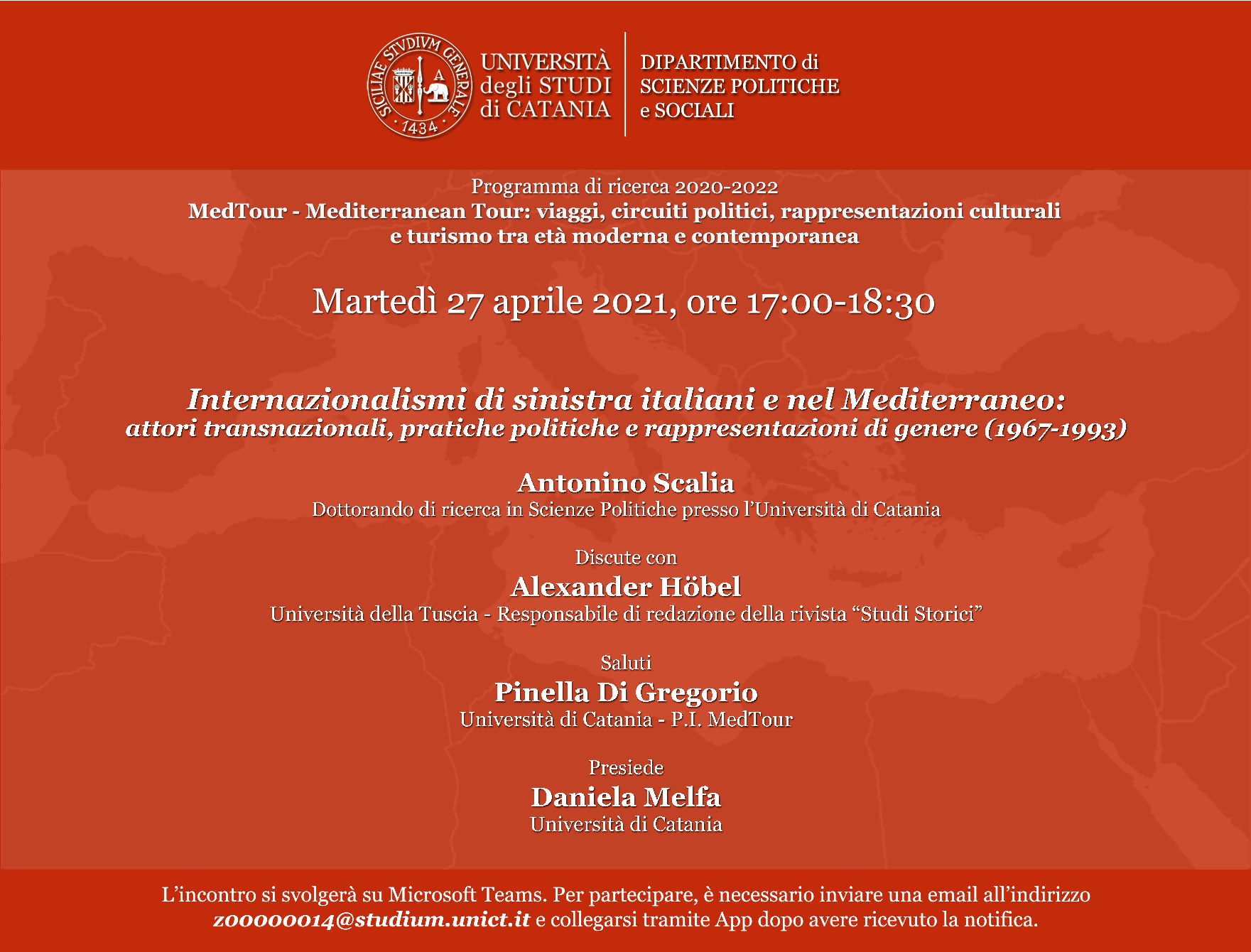 Martedì 27 aprile alle ore 17.00 Antonino Scalia discuterà con Alexander Höbel il paper Internazionalismi di sinistra italiani e Mediterraneo: attori transnazionali, pratiche politiche e rappresentazioni di genere (1967-1993).
