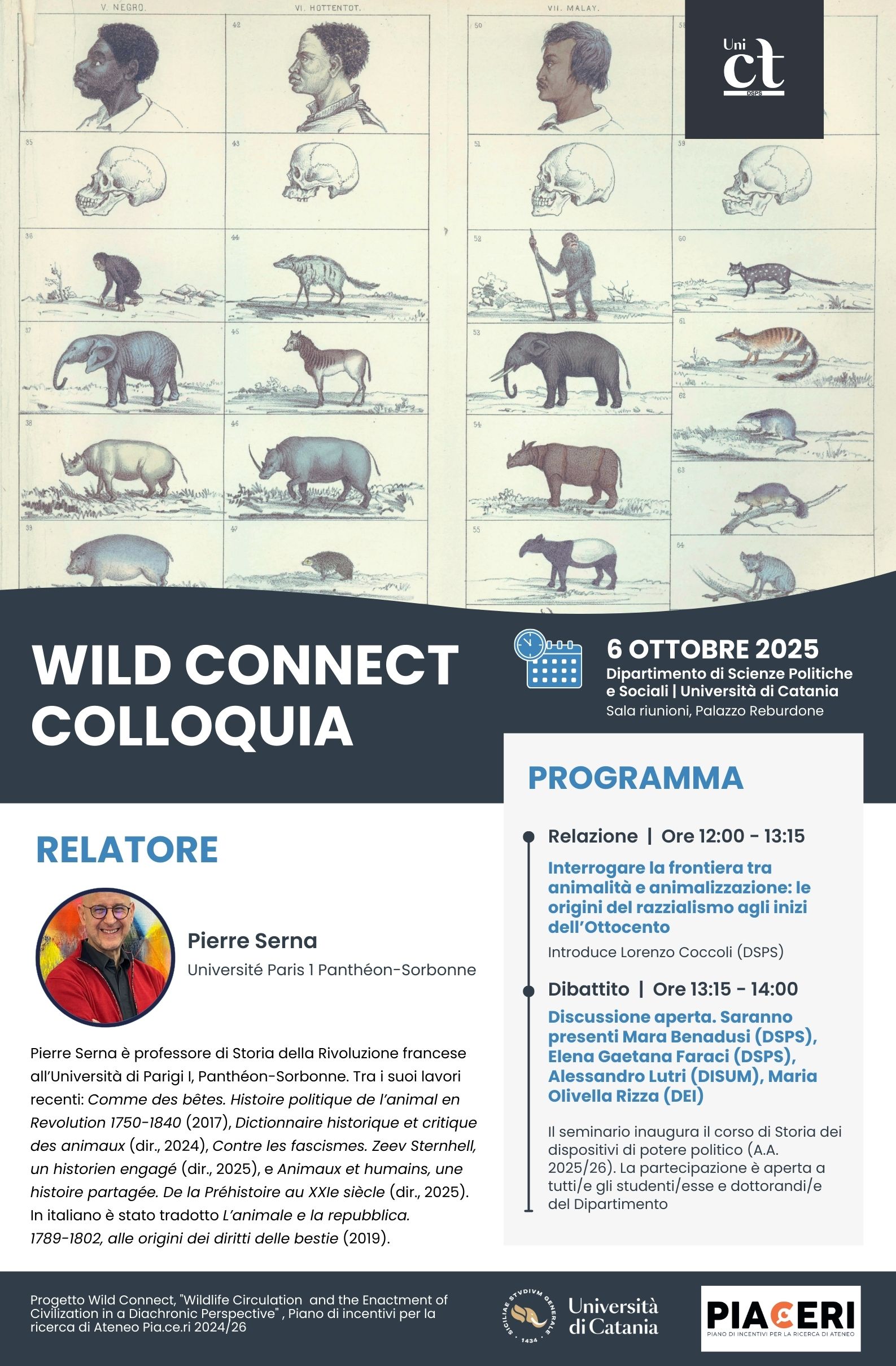 Terzo incontro del ciclo di seminari WILD CONNECT Colloquia, che si terrà il 6 ottobre in Sala Riunioni di Palazzo Reburdone, alle ore 12.00. Interverrà il prof. Pierre Serna della Università di Parigi-Sorbona, introdurrà il prof. Lorenzo Coccoli. Il seminario inaugura il corso di Storia dei dispositivi di potere politico. L’evento è aperto alla partecipazione di studenti/esse e dottorandi/e del Dipartimento