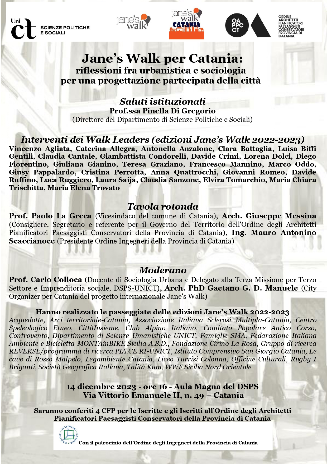 Si svolgerà il 14 Dicembre 2023 a partire dalle 16.00, presso l'Aula Magna del Dipartimento di Scienze Politiche e Sociali dell’Università di Catania, il seminario: Jane’s Walk per Catania: riflessioni fra urbanistica e sociologia per una progettazione partecipata della città.