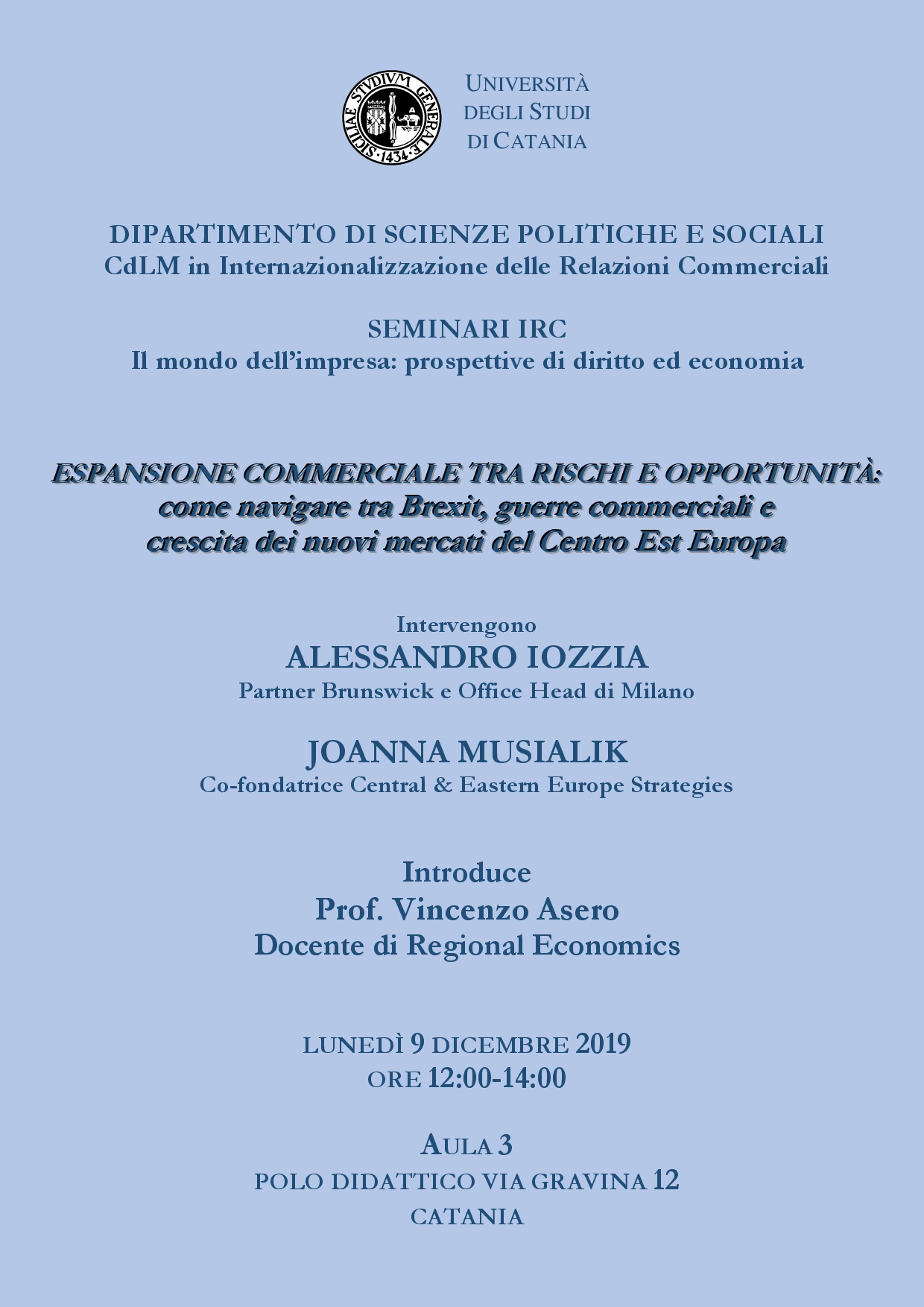 Questi argomenti saranno oggetto di due giornate di studio coordinate dal prof. Vincenzo Asero che si svolgeranno nell’ambito delle attività didattiche di Regional Economics per il Corso di Laurea in Internazionalizzazione delle Relazioni Commerciali. Giorno 9 dicembre interverranno Alessandro Iozzia, Partner Brunswick e Office Head di Milano, e Joanna Musialik, Co-fondatrice di Central & Eastern Europe Strategies. Giorno 11 dicembre sarà la volta di Emilia Arrabito e Barbara Sarnari [Locandina] della Svi.Med. Onlus – Centro Euromediterraneo per lo Sviluppo Sostenibile.