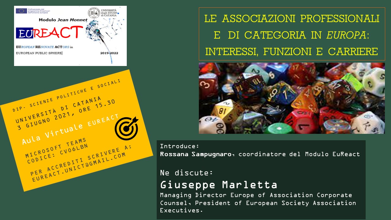 L’incontro è dedicato al tema della difesa degli interessi economici e sociali all’interno della UE. Il Dott. Marletta, laureato a Catania in Relazioni Pubbliche più di 10 anni fa, con una lunga esperienza nell’ambito delle associazioni che difendono le categorie professionali all’interno a livello europeo, parlerà dell’attuale ruolo delle organizzazioni che difendono gli interessi nella definizione delle politiche, di come si sia modificata la loro attività in presenza della piattaforma digitale e di quali siano le prospettive future. Come si accede alla professione, quali sono i titoli preferenziali, quanto conta la motivazione personale? Il dott. Marletta, partendo dalla sua esperienza, approfondirà il tema delle carriere nell’ambito delle attività di lobbying e di advocacy, indicando quali siano le vie di accesso preminenti e le competenze più richieste