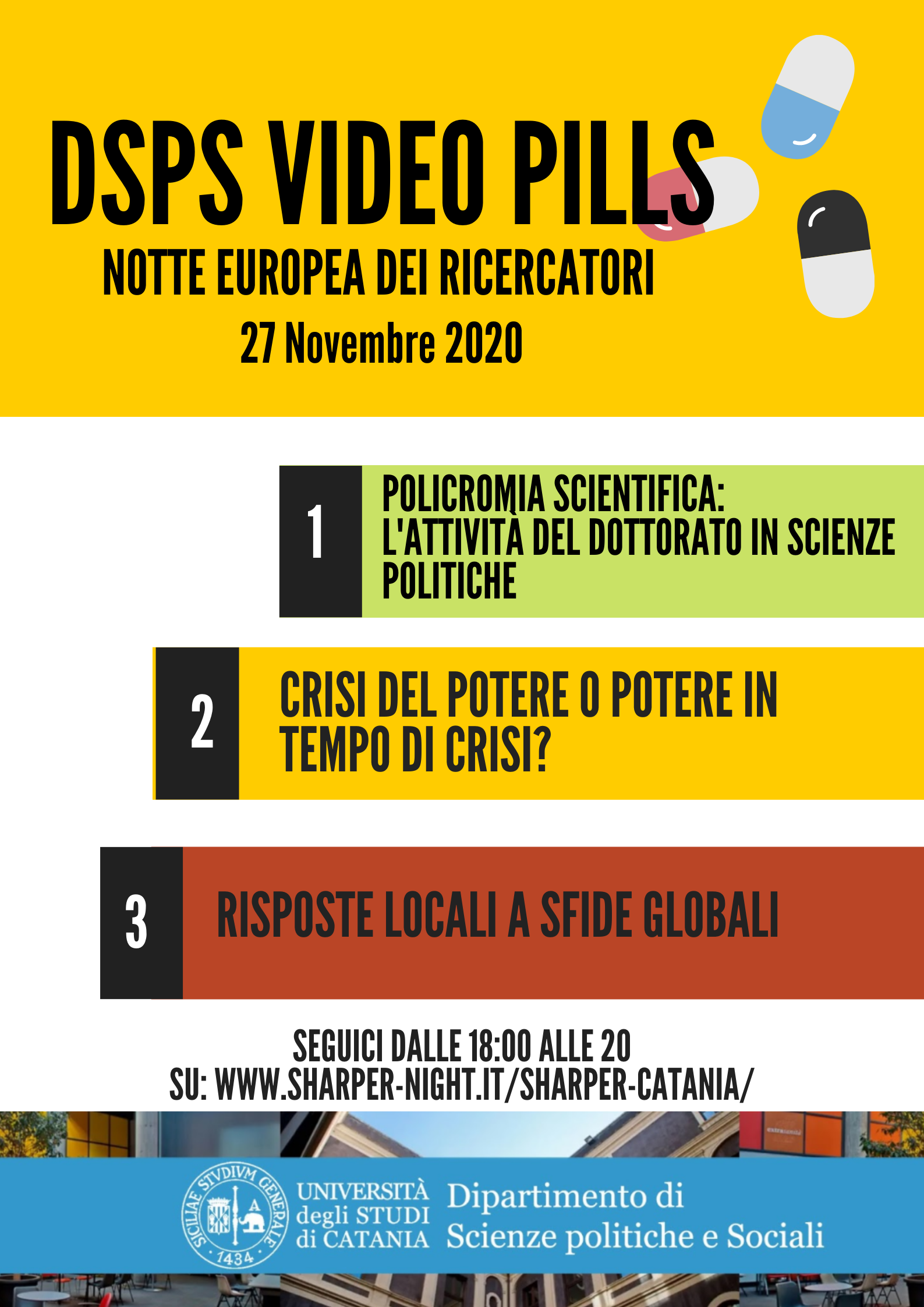 - DSPS Video Pills: tre brevi video dedicati alla ricerca di dipartimento. Il primo video sarà dedicato al tema "Policromia Scientifica: l'esperienza del dottorato in Scienze Politiche. Il secondo è intitolato "Crisi del potere o potere in tempo di crisi?", mentre il terzo riguarderà "Risposte locali a sfide globali". Le "pillole" saranno visibili il 27 novembre rispettivamente alle 18;00, alle 19:00 e alle 20:00 sulla nostra pagina YouTube: https://www.youtube.com/channel/UCnX4okn5iiGwI5WKN-aoEOQ