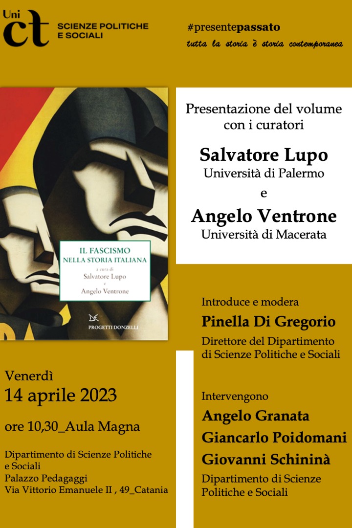 Un nuovo appuntamento del ciclo #presentepassato presso il Dipartimento di Scienze Politiche e Sociali. Venerdì 14 aprile, alle ore 10,30, nell’Aula Magna di Palazzo Pedagaggi (via Vittorio Emanuele, 49) sarà presentato il volume Il fascismo nella storia italiana (Donzelli, 2022) con la partecipazione dei due curatori, Salvatore Lupo (Università di Palermo) e Angelo Ventrone (Università di Macerata).