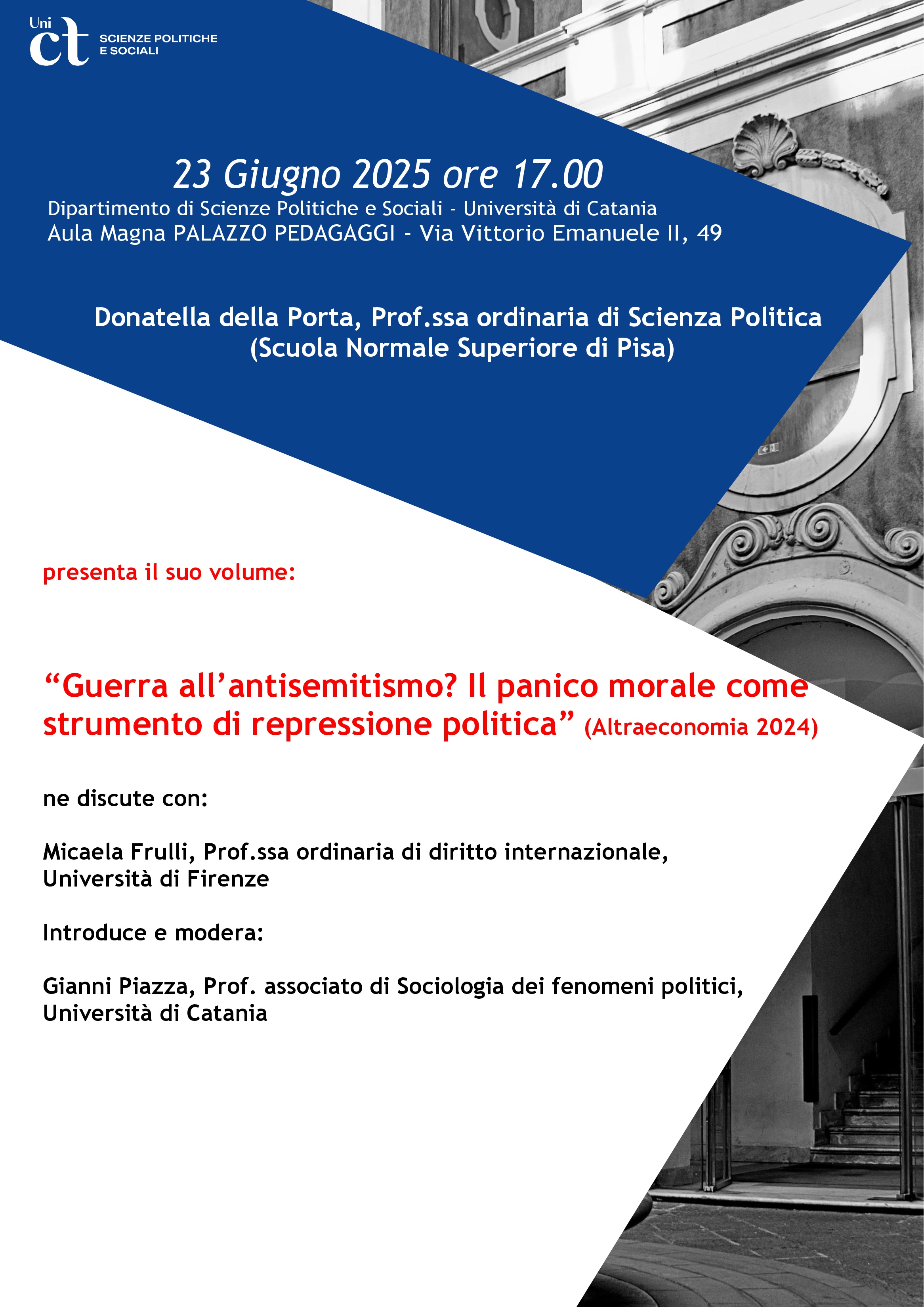 L’evento si svolgerà alle 17.00 del 23 giugno 2025, presso l’Aula Magna del Dipartimento di Scienze Politiche e Sociali dell’Università di Catania, in via Vittorio Emanuele 49, alla presenza dell’autrice, Professoressa ordinaria di Scienza Politica presso la Scuola Normale Superiore di Pisa, insieme a Micaela Frulli, professoressa ordinaria di Diritto Internazionale presso l’Università di Firenze. Introduce e modera, Gianni Piazza, professore associato di Sociologia dei fenomeni politici presso l’Università di Catania