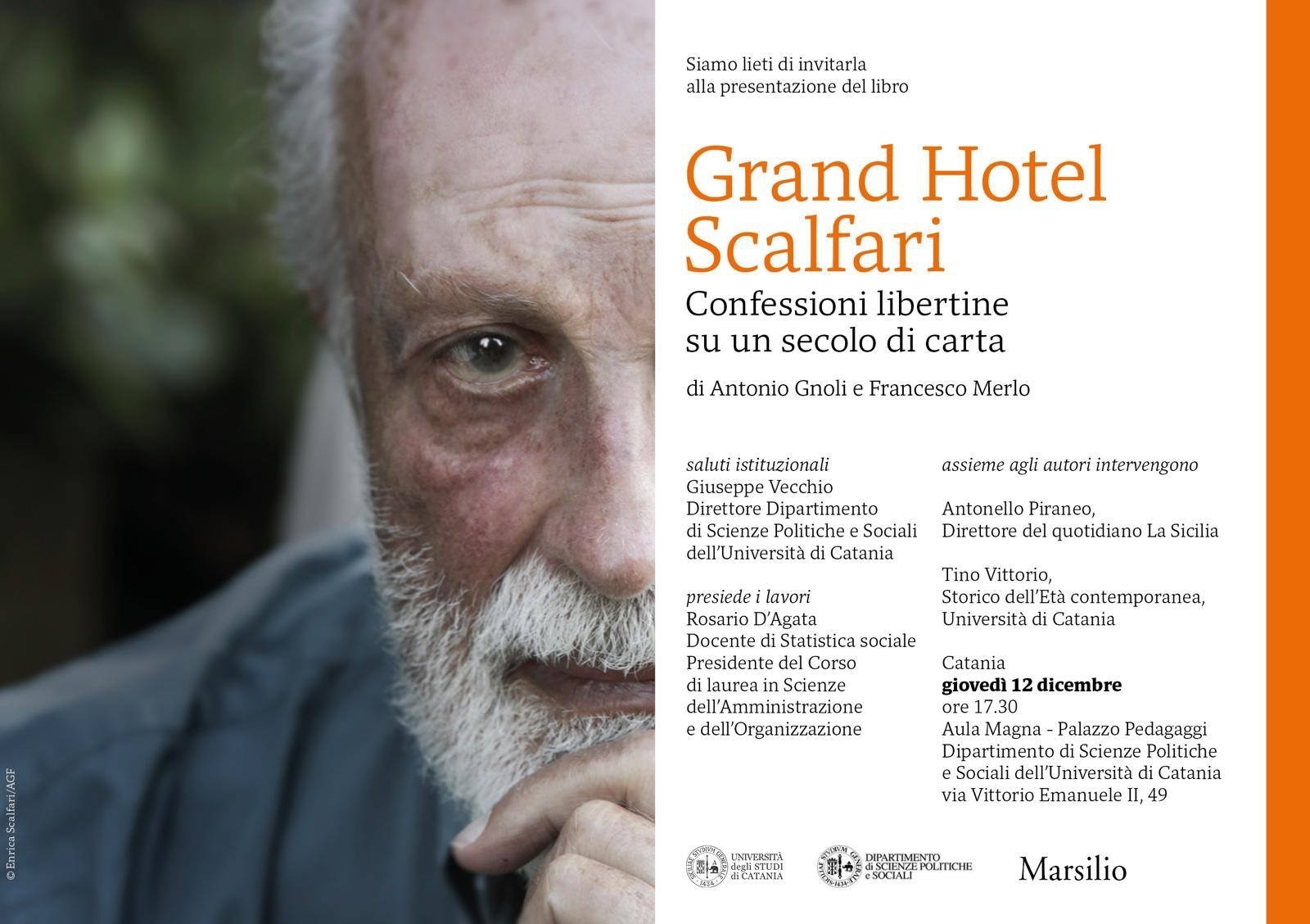 Giovedì 12 dicembre alle ore 17:30, presso l'Aula Magna di Palazzo Pedagaggi, via Vittorio Emanuele II, 49, sede del Dipartimento di Scienze Politiche e Sociali dell'Università degli Studi di Catania, sarà presentato il volume di Francesco Merlo e Antonio Gnoli, 'Grand Hotel Scalfari', Marsilio 2019. Ai saluti istituzionali del Direttore del Dsps, prof. Pippo Vecchio, seguirà l'introduzione del prof. Rosario D'Agata, presidente del Cdl in Scienze dell'Amministrazione e dell'Organizzazione. Dialogheranno con gli autori Antonello Piraneo, direttore del quotidiano lasicilia.it e, Tino Vittorio, Storico dell'età contemporanea UniCt.