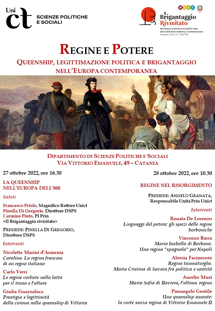 Il 27 e 28 ottobre 2022, il Dipartimento di Scienze Politiche e Sociali (Aula Magna, via Vittorio Emanuele, 49) ospita il convegno “Regine e Potere. Queenship, legittimazione e brigantaggio nell’Europa contemporanea”, realizzato nell’ambito del progetto Prin 2017 “Il brigantaggio rivisitato. Narrazioni, pratiche e usi politici nella storia dell’Italia moderna e contemporanea”.