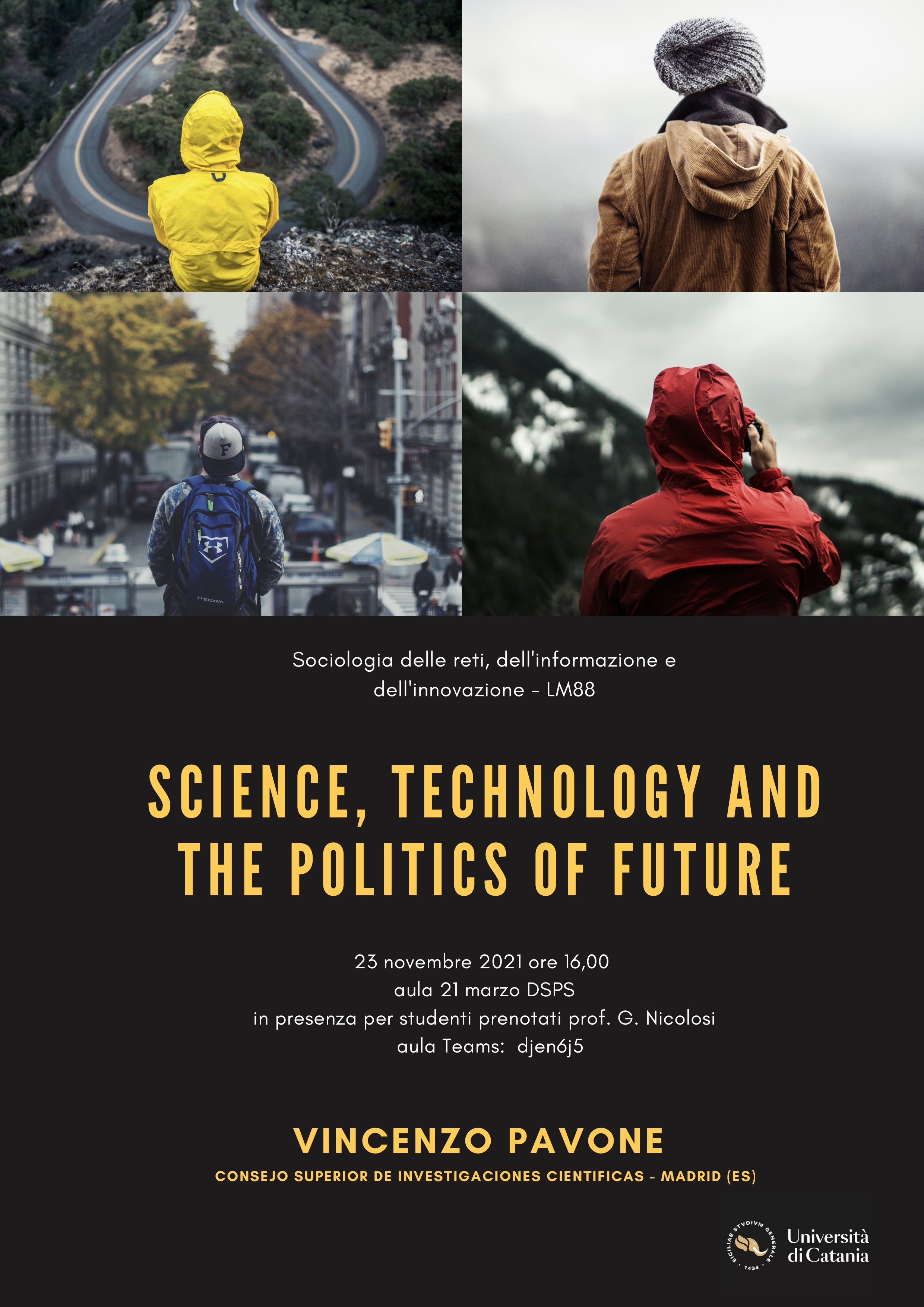 Il 23 Novembre 2021, ore 15, 30 si terrà a Palazzo Padagaggi, presso l'Aula 21 Marzo, il seminario di Vincenzo Pavone, ricerctore del Consejo Superior de Investigaciones Cientificas di Madrid, sul tema "Science, Technology and the Politics of Future"