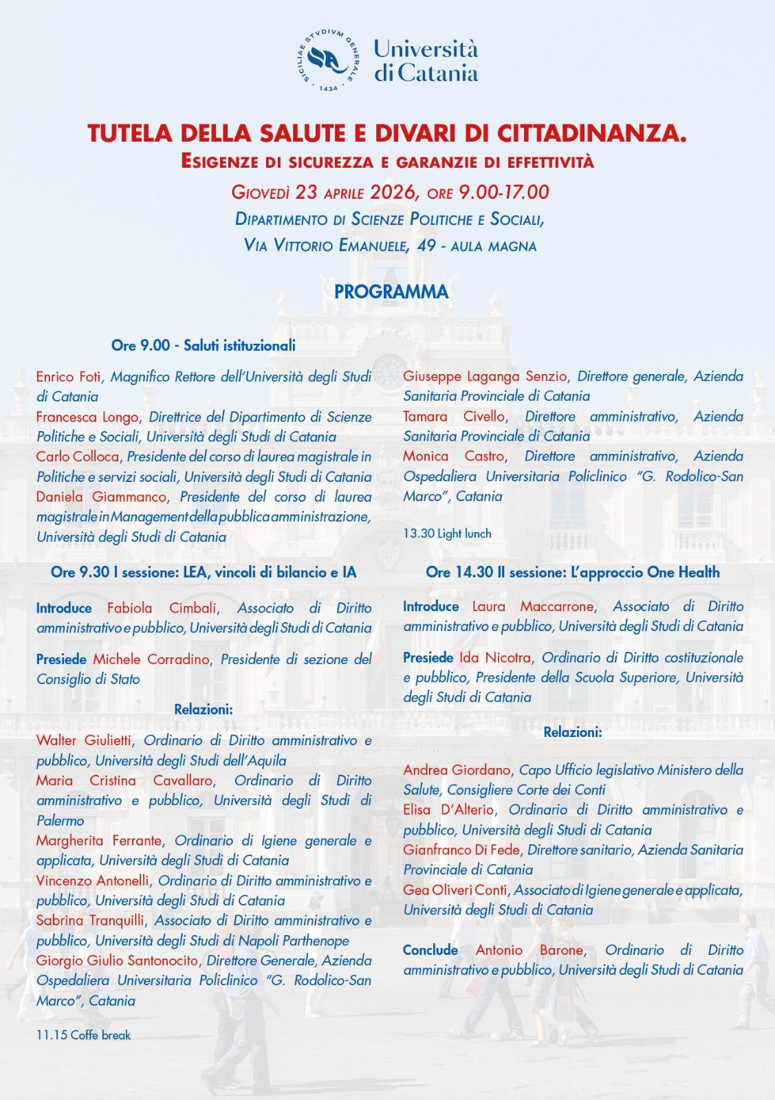 I saluti del Magnifico Rettore, Prof. Enrico Foti, della Direttrice del Dipartimento, Prof.ssa Francesca Longo e dei Presidenti dei corsi di Laurea che hanno sposato l’iniziativa, Professori Carlo Colloca e Daniela Giammanco, daranno avvio al Convegno che si articolerà in due sessioni: nella prima, presieduta da Michele Corradino, Presidente di Sezione del Consiglio di Stato, si valuteranno i rapporti fra LEA, vincoli di bilancio ed intelligenza artificiale; nella seconda sessione, coordinata dalla Prof.ssa Ida Angela Nicotra, Presidente della Scuola Superiore di Catania, l’attenzione sarà rivolta all’utilità dell’approccio One-Health. Le conclusioni saranno affidate al Prof. Antonio Barone dell’Università di Catania. Su questi temi si confronteranno gli illustri relatori provenienti non soltanto dal mondo accademico (Università di Catania, L’Aquila, Napoli Parthenope, Palermo) ma anche dall’alta dirigenza sanitaria pubblica (ASP CT, Policlinico UniCT), dalla magistratura amministrativa e contabile e dal Ministero della salute, nell’ottica di promuovere una interlocuzione costruttiva, quale contributo alla definizione concreta di strategie programmatorie e di intervento operativo che garantiscano l’effettività del diritto alla salute e la sicurezza sanitaria, andando oltre ogni forma di divario territoriale e superando gli ostacoli di carattere economico-finanziario.