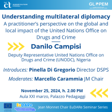 Lunedì 25 novembre alle 14.00 nell’Aula XXI Marzo dell'Edificio Palazzo Pedagaggi, il Dipartimento di Scienze Politiche e Sociali ospiterà un seminario di Danilo Campisi, Vice Rappresentante dell'Ufficio delle Nazioni Unite contro la Droga e il Crimine (UNODC) in Nigeria. Danilo Campisi offrirà una prospettiva unica sui mandati globali e nazionali dell'UNODC, racconterà le responsabilità quotidiane di un funzionario delle Nazioni Unite sul campo e discuterà le competenze professionali richieste all'interno dell'organizzazione.