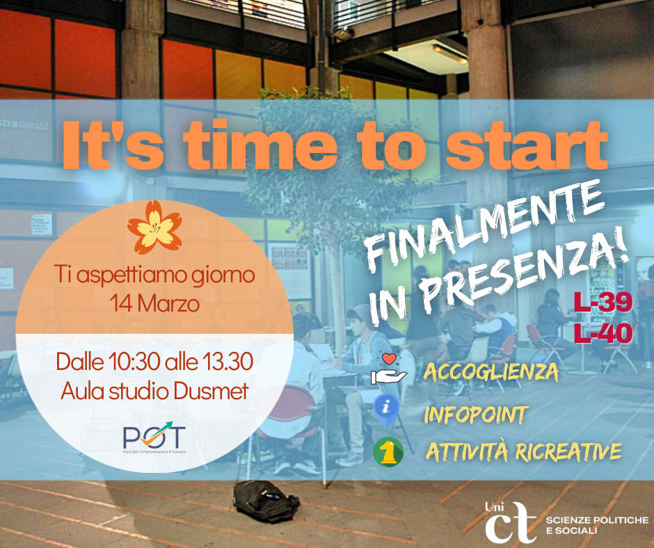 Si comunica che i Tutor POT di L39/L40 insieme al CDL hanno organizzato un incontro di orientamento e socializzazione per le matricole per lunedì, 14 marzo, dalle ore 10:30 alle ore 13:30, presso l’aula Studio Dusmet.