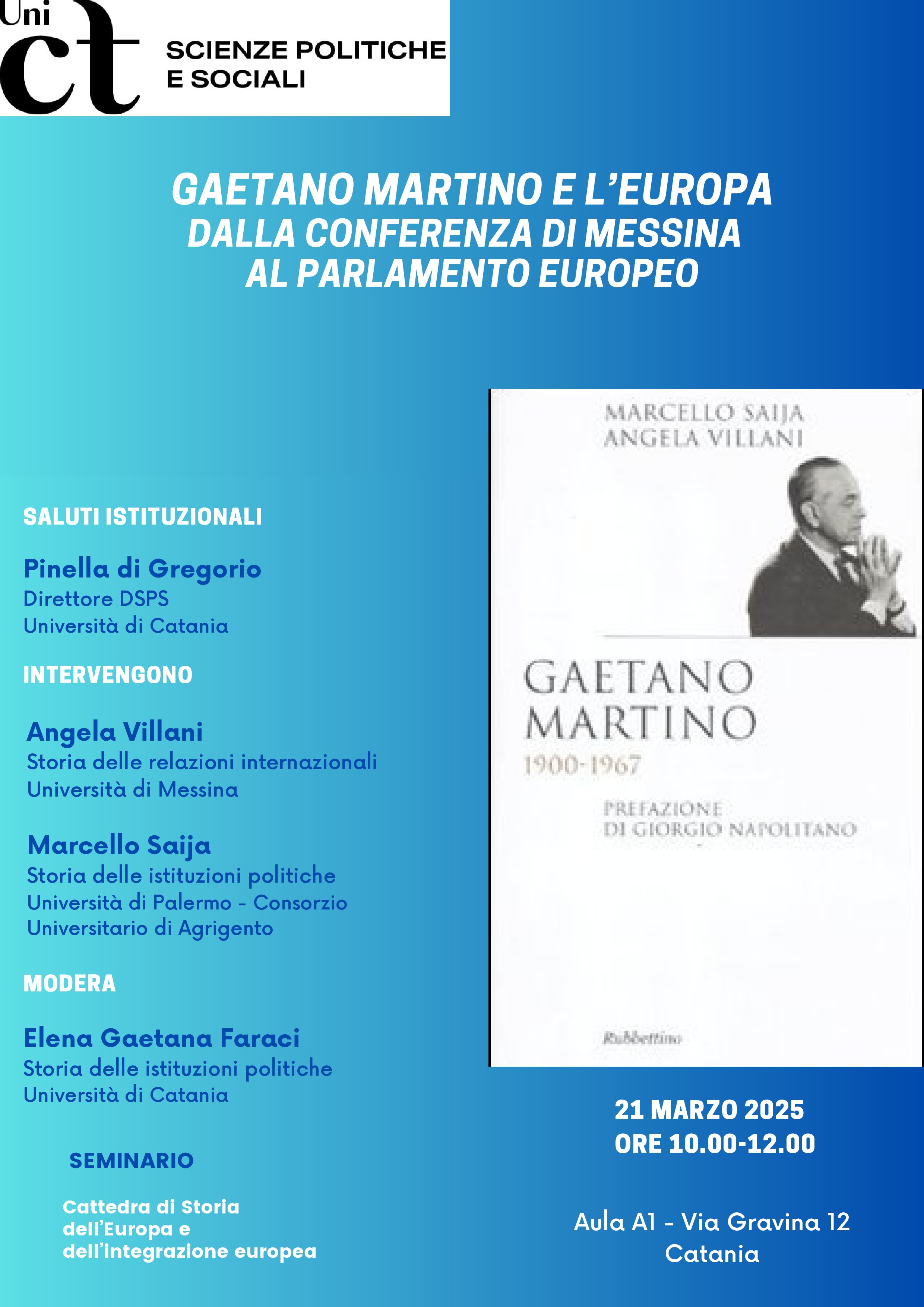 Il seminario, volto a ricostruire la visione europeista e l’impegno dello statista siciliano nell’ultimo decennio della sua esistenza per il processo di costruzione dell’Europa, vede la partecipazione di due autorevoli studiosi, la professoressa Angela Villani, ordinaria di Storia delle relazioni internazionali dell’Università di Messina, e il professore Marcello Saija, già ordinario di Storia delle istituzioni politiche dell’Università di Palermo e attualmente presidente del corso di Laurea triennale di Studi superiori in mediazione linguistica e culturale presso il Consorzio Universitario di Agrigento, autori del volume Gaetano Martino 1900-1967, prefazione di Giorgio Napolitano, Rubbettino 2011.