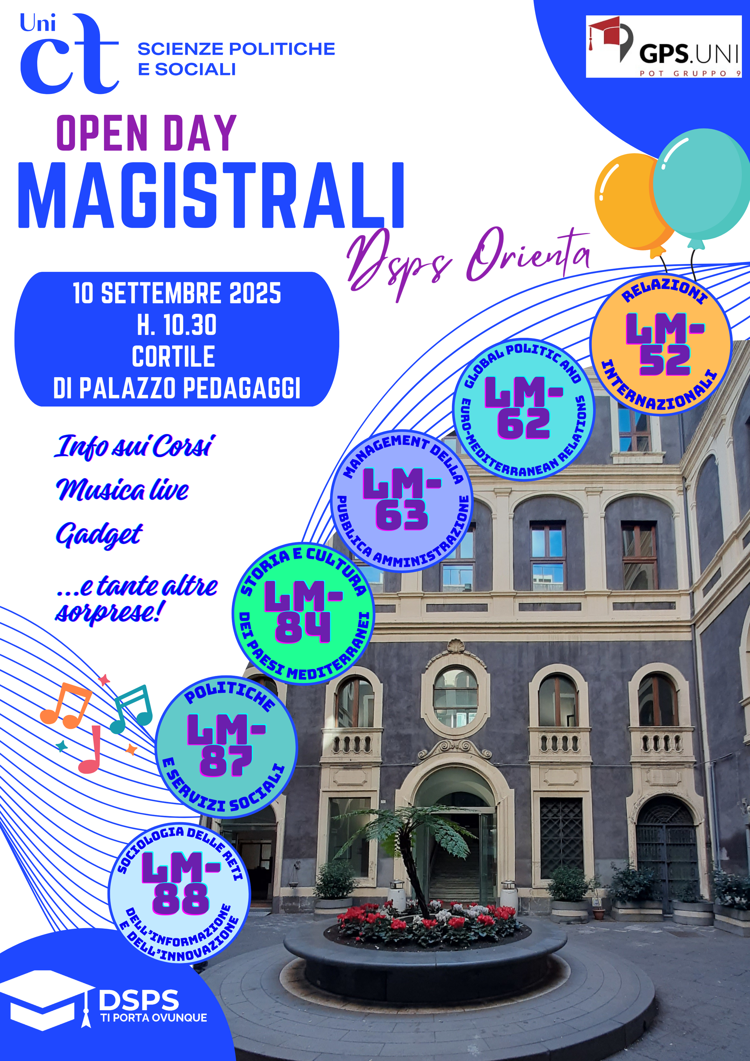 Mercoledì 10 settembre 2025, a partire dalle 10,30, il cortile di Palazzo Pedagaggi ospiterà l’Open Day dedicato alle Lauree Magistrali del DSPS. L’evento sarà l’occasione per conoscere da vicino l’offerta formativa e gli sbocchi occupazionali dei Corsi, entrare in contatto con docenti, tutor e studenti, ricevere informazioni e supporto per perfezionare le procedure di iscrizione e trascorrere una giornata festosa in vista dell’avvio del nuovo anno accademico, con musica, gadget e altre sorprese per i partecipanti.